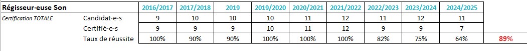 - 89% des stagiaires ayant passé leur certification ont été admis au titre de Régisseur Son.